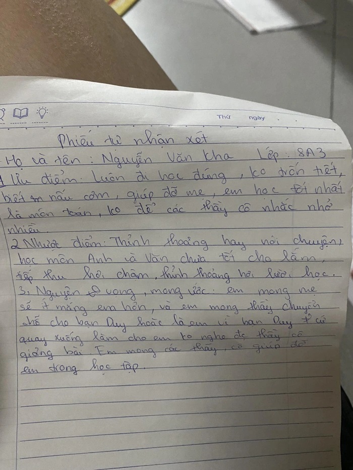 Mới đây, mạng xã hội đang chia sẻ câu chuyện liên quan đến việc họp phụ huynh khiến dân mạng vô cùng thích thú. Theo đó, trước kỳ họp phụ huynh diễn ra, thầy giáo đã yêu cầu tất cả các học trò hãy viết tự nhận xét, trong đó nêu ra ưu điểm, khuyết điểm và nguyện vọng của mình trong thời gian tới. Trong buổi họp phụ huynh, thầy giáo để gửi lại cho cha mẹ để phần nào hiểu con mình hơn.