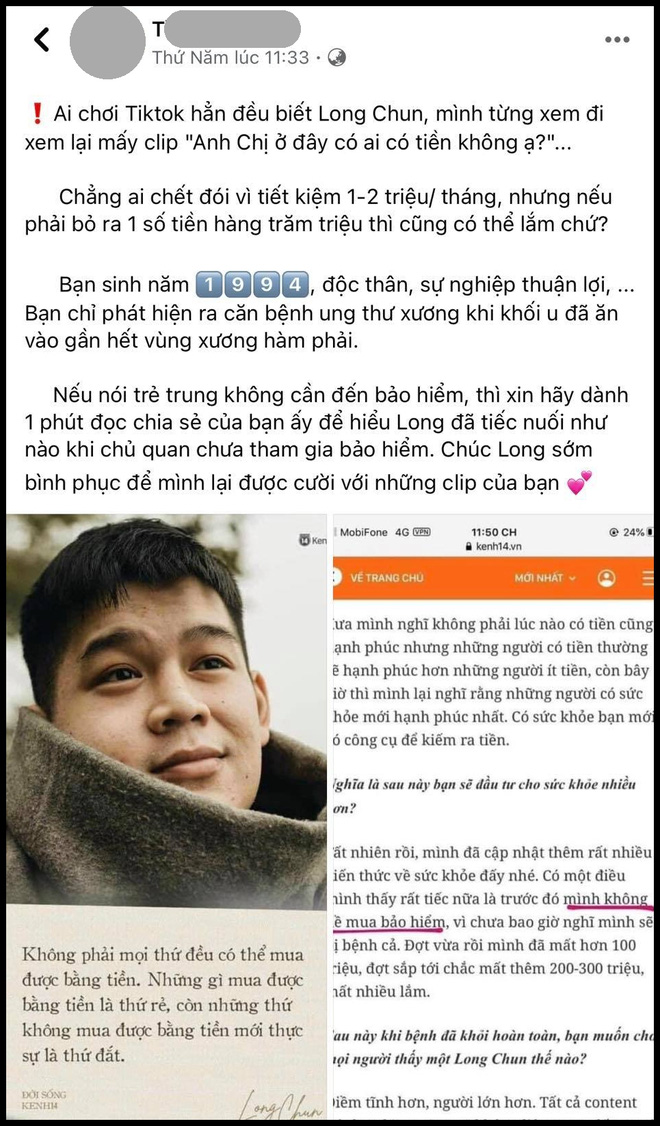 Dù đã chia sẻ về căn bệnh từ cuối năm 2020 và thậm chí phải ngưng mọi hoạt động để chữa bệnh nhưng trong những ngày đầu năm mới, căn bệnh của nam TikToker đã bị khui lại theo cách không ai mong muốn: hình ảnh và căn bệnh của anh bị sử dụng để quảng cáo bán bảo hiểm. Mà thậm chí người bán còn bịa đặt Long Chun bị ung thư xương.