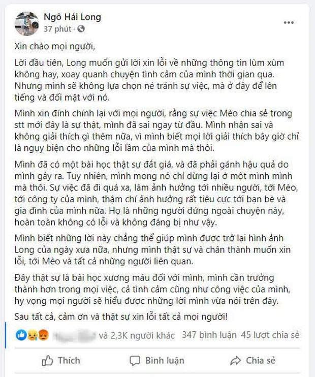 Những ngày qua, cộng đồng mạng Việt Nam đã được phen "dậy sóng" với drama giữa 2 hot TikToker là Mèo Sao Hỏa và Long Men. Sau khi bị cô bạn Rainy Tran và chính người yêu cũ phanh phui vì thái độ và lời lẽ tệ bạc, đến ngày 22/3, Long Men đã chính thức lên tiếng thừa nhận toàn bộ sai lầm của bản thân trên Facebook kèm lời xin lỗi.