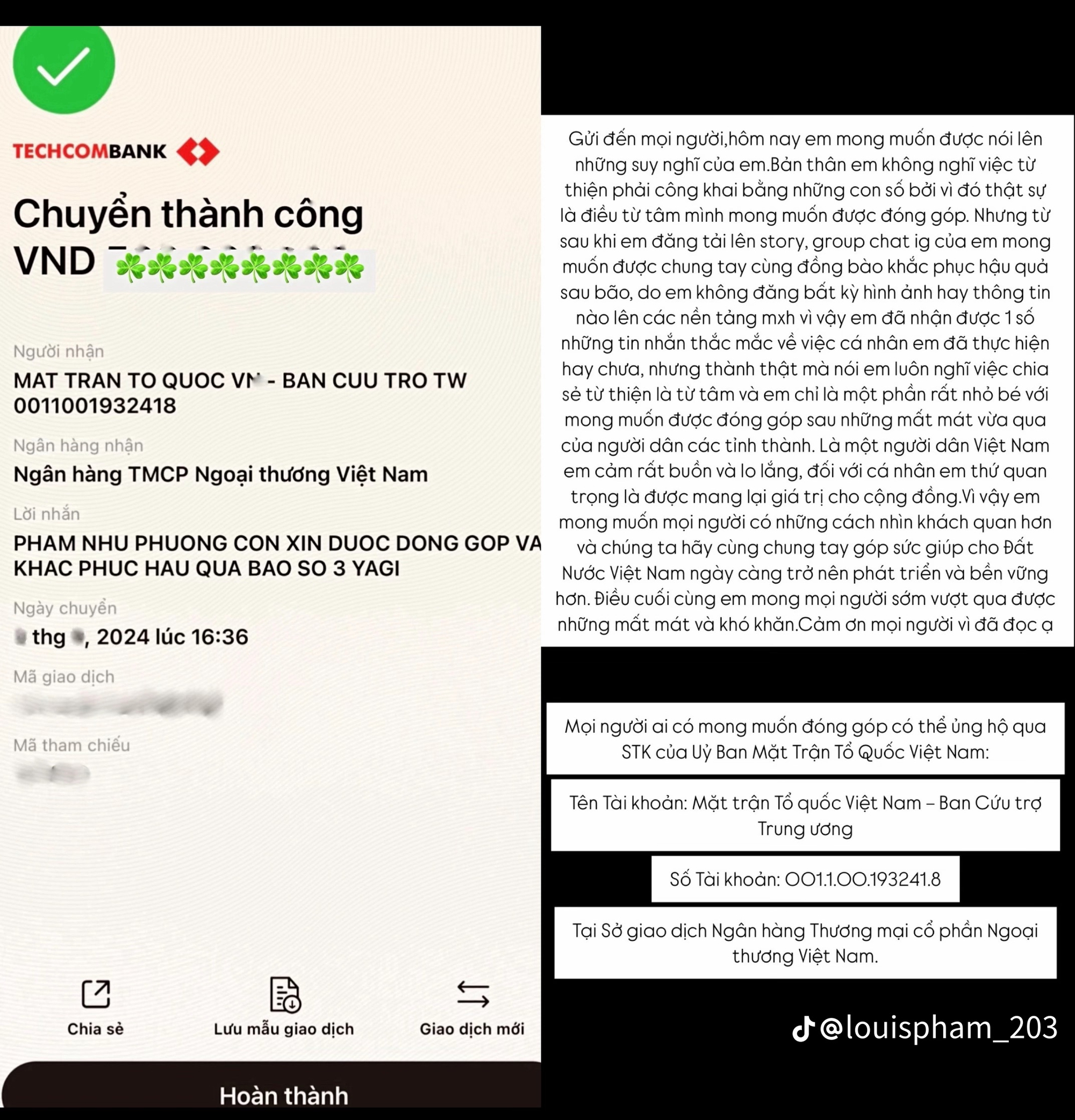 Louis Phạm cho biết: "Mọi người ơi, mình không thể biết đây có thể là mình hay không. Vì có thể có những người tên giống mình và cùng một nội dung. Hơn nữa mình chuyển khoản vào những STK khác nhau, cùng nội dung hoặc khác nội dung, vì vậy mình vẫn sẽ không công khai".