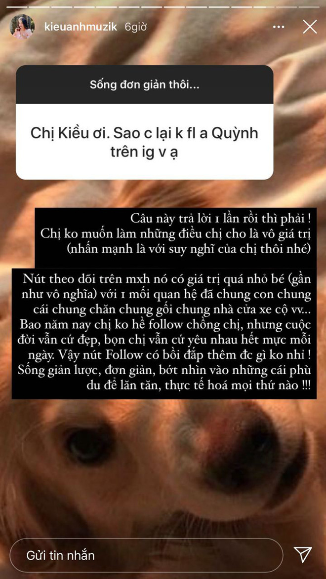 Giải thích về lý do không theo dõi người yêu/ chồng trên MXH, Hà Trúc cho hay: "Chị không follow vì mỗi lúc giận dỗi mắc công unfollow...". Còn ca nương Kiều Anh thì đưa ra lý do dài hơn. Theo suy nghĩ cá nhân của Kiều Anh thì đó là hành động "vô giá trị".