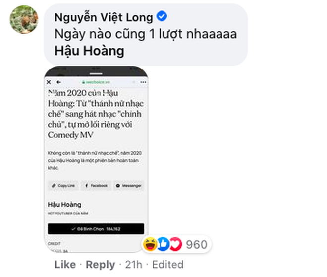 Hay như khi Hậu Hoàng lọt vào danh sách đề cử của WeChoice Awards 2020, Mũi trưởng đã công khai kêu gọi vote cho cô nàng ngay trên Facebook, đồng thời tiết lộ ngày nào mình cũng vote ít nhất một lần