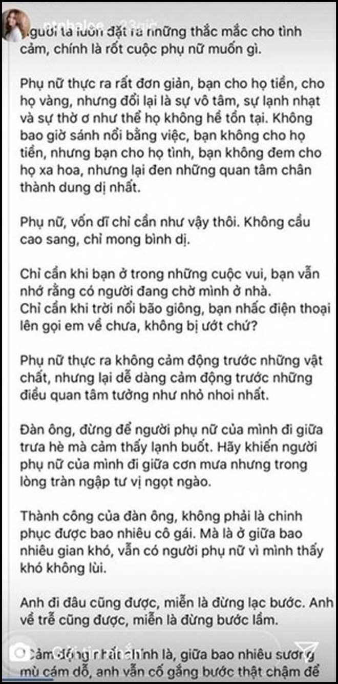Trước đó, Nhật Lê cũng từng gây chú ý khi chia sẻ lại một bài viết về việc đàn ông nên yêu phụ nữ ra sao: "Người ta luôn đặt ra những thắc mắc cho tình cảm, chính là rốt cuộc phụ nữ muốn gì?".