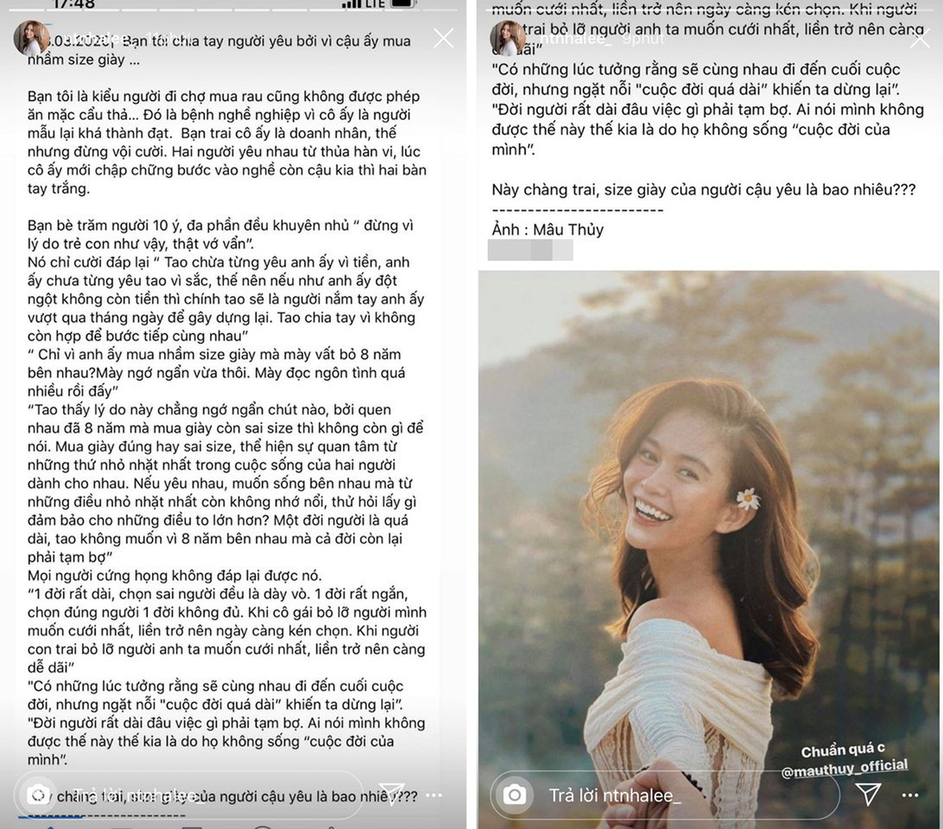 Được biết, nội dung của bài viết này là chia sẻ trên phương diện một người bạn của Mâu Thủy về cuộc tình mới tan vỡ của cô. Người bạn này ban đầu cũng cho rằng Mâu Thủy yêu cầu quá cao xa để rồi chia tay vì lý do "ngớ ngẩn". Thế nhưng Mâu Thủy đáp lại: "Mua giày đúng hay sai size, thể hiện sự quan tâm từ những thứ nhỏ nhặt nhất trong cuộc sống của hai người dành cho nhau. Nếu yêu nhau, muốn sống bên nhau mà từ những điều nhỏ nhặt nhất còn không nhớ nổi, thử hỏi lấy gì đảm bảo cho những điều to lớn hơn? Một đời người là quá dài, tao không muốn vì 8 năm bên nhau mà cả đời còn lại phải tạm bợ".