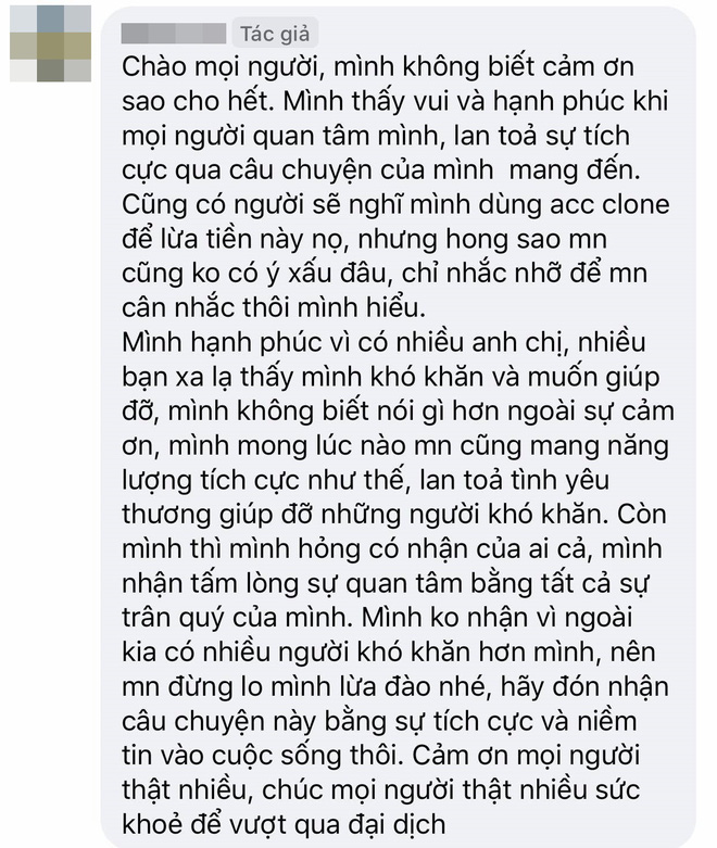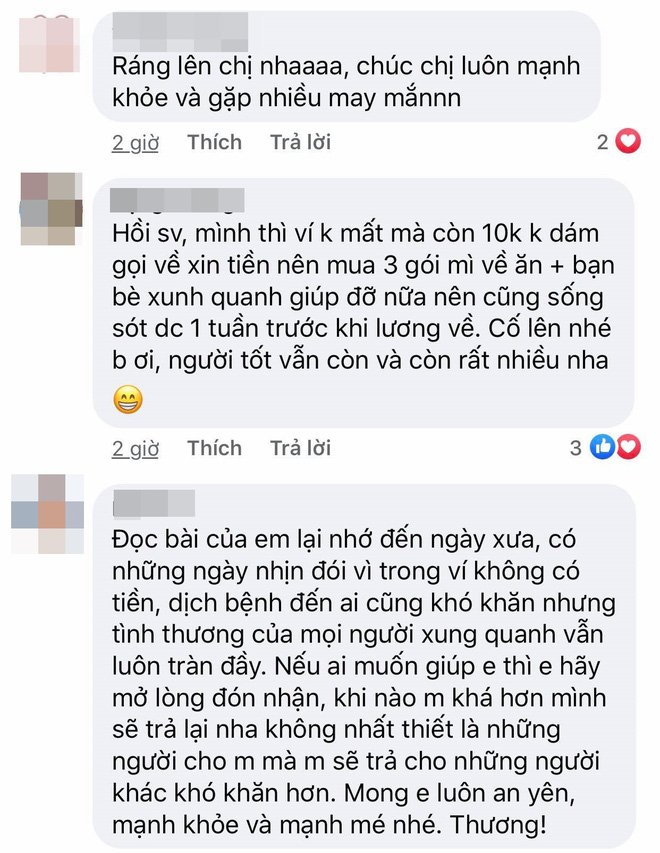 "Cố lên nha bé ơi, dịch bệnh ai cũng khó khăn nhưng cũng vì thế mà nhận ra xung quanh mình còn rất là nhiều tình người. Gửi đến em 1 cái ôm từ SG và mong em luôn mạnh mẽ và giữ gìn sức khỏe, có khó khăn thế nào thì mình cũng vượt qua được hết nha".