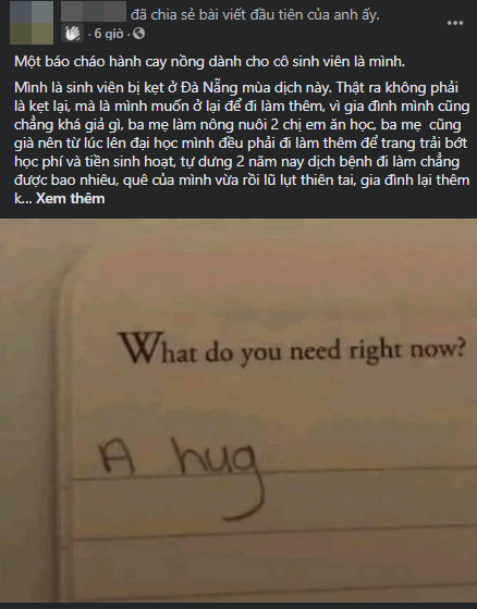 Theo đó, cô gái M.A sinh ra và lớn lên trong một gia đình làm nông, ba mẹ cũng lớn tuổi nên từ lúc lên Đà Nẵng học đại học cô đã phải đi làm thêm để trang trải học phí và tiền sinh hoạt. Tuy nhiên 2 năm nay, dịch bệnh Covid-19 xuất hiện khiến việc đi làm gặp nhiều khó khăn.