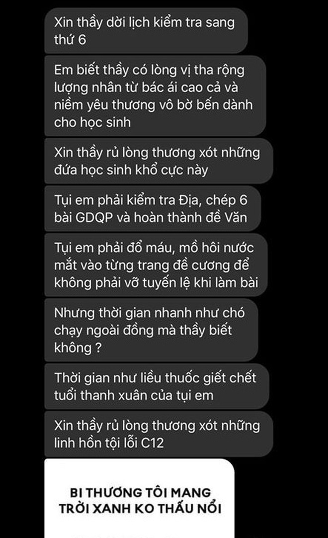 "Xin thầy dời lịch kiểm tra sáng thứ 6. Em biết thầy có lòng vị tha rộng lượng, nhân từ, bác ái, cao cả và niềm yêu thương vô bờ bến dành cho học sinh. Xin thầy rủ lòng thương xót những đứa học sinh khổ cực này.