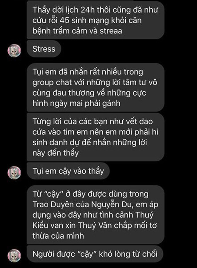 Tụi em đã nhắn rất nhiều trong group chat với lời tâm tư vô cùng đau thương về những cực hình ngày mai phải gánh. Từng lời của các bạn như vết dao cứa vào tim em nên em phải hi sinh danh dự để nhắn những lời này đến thầy.
