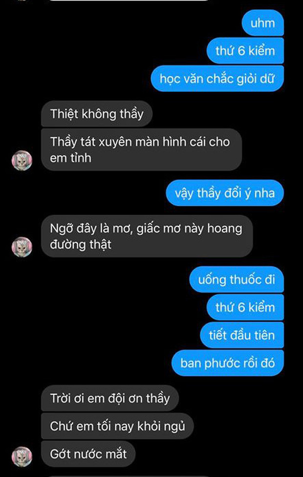 Quả nhiên trước sự tích cực của cô bạn, thầy giáo đã cho lùi ngày thi thêm một hôm nữa. Khỏi phải nói, cô nàng đã mừng rỡ vội rep tin nhắn: "Thiệt không thầy? Thấy tát xuyên màn hình cái cho em tỉnh? Ngỡ đây là mơ, giấc mơ này hoang đường thật".