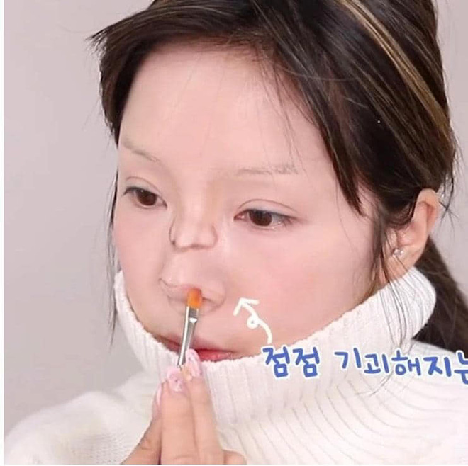 Cô gái mặc áo len cao cổ, che lên cả phần môi. Sau đó vẽ mũi giả ở vị trí giữa sống mũi thật. Hai cánh mũi được biến hóa khéo léo thành đôi môi.
