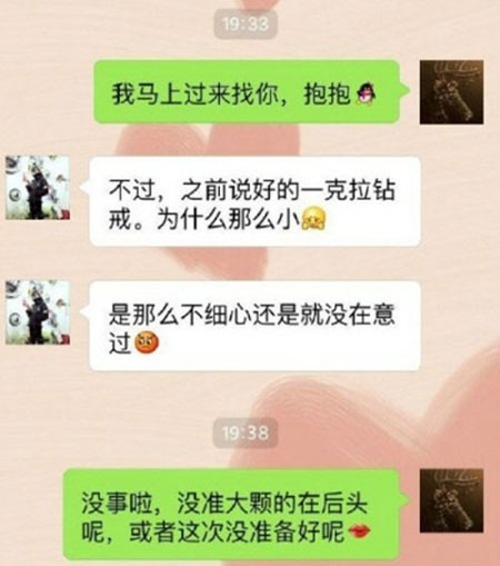 Sau đó, nguyên nhân cô gái từ chối lời cầu hôn được tiết lộ. Theo một tin nhắn được cho là của cô gái nhắn với bạn của mình, cô đã rất bực tức và nói: "Nhưng anh ấy đã đồng ý mua cho tớ một chiếc nhẫn kim cương lớn cỡ một carat. Tại sao chiếc nhẫn kim cương cầu hôn tớ lại quá nhỏ như vậy? Là anh ấy bất cẩn hay anh ấy chưa bao giờ quan tâm đến tớ, lắng nghe tớ nói?".