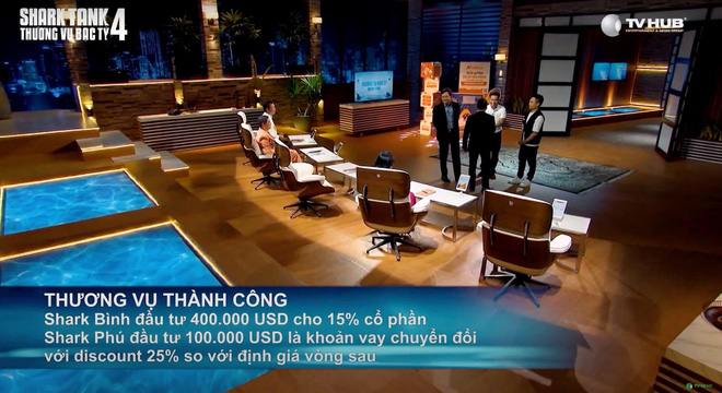 Sau khi nghe thương lượng, Shark Phú lần nữa đổi đề nghị của mình thành 200.000 USD cho 7% cổ phần và 300.000 USD dưới dạng khoản vay chuyển đổi với chiết khấu 30% so với định giá ở vòng sau.