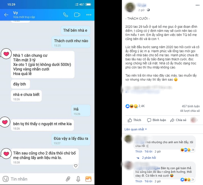 - Phong tục bên đó thách cưới như vậy thôi. Số tiền đấy so với mặt bằng chung cũng là bình thường. Sao bạn không thương lượng lại với nhà bên đó xem, chứ đăng lên thế này cũng có giải quyết được vấn đề gì đâu.