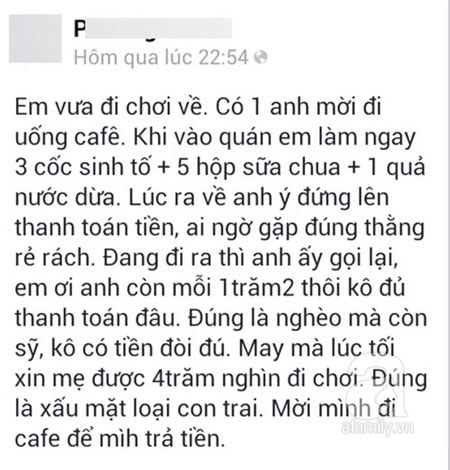 Cô viết: "Em vừa đi chơi về. Có một anh mời đi uống café. Khi vào quán em làm ngay 3 cốc sinh tố, 5 hộp sữa chua và một quả nước dừa. Lúc ra về anh ý đứng lên thanh toán tiền, ai ngờ gặp đúng thằng giẻ rách. Đang đi ra thì anh ấy gọi lại, em ơi anh còn mỗi trăm hai thôi không đủ tiền thanh toán đâu. Đúng là nghèo mà còn sĩ, không có tiền đòi đú. May mà lúc tối xin mẹ được 4 trăm nghìn đi chơi. Đúng là xấu mặt loại con trai. Mời mình đi café để mình trả tiền”.