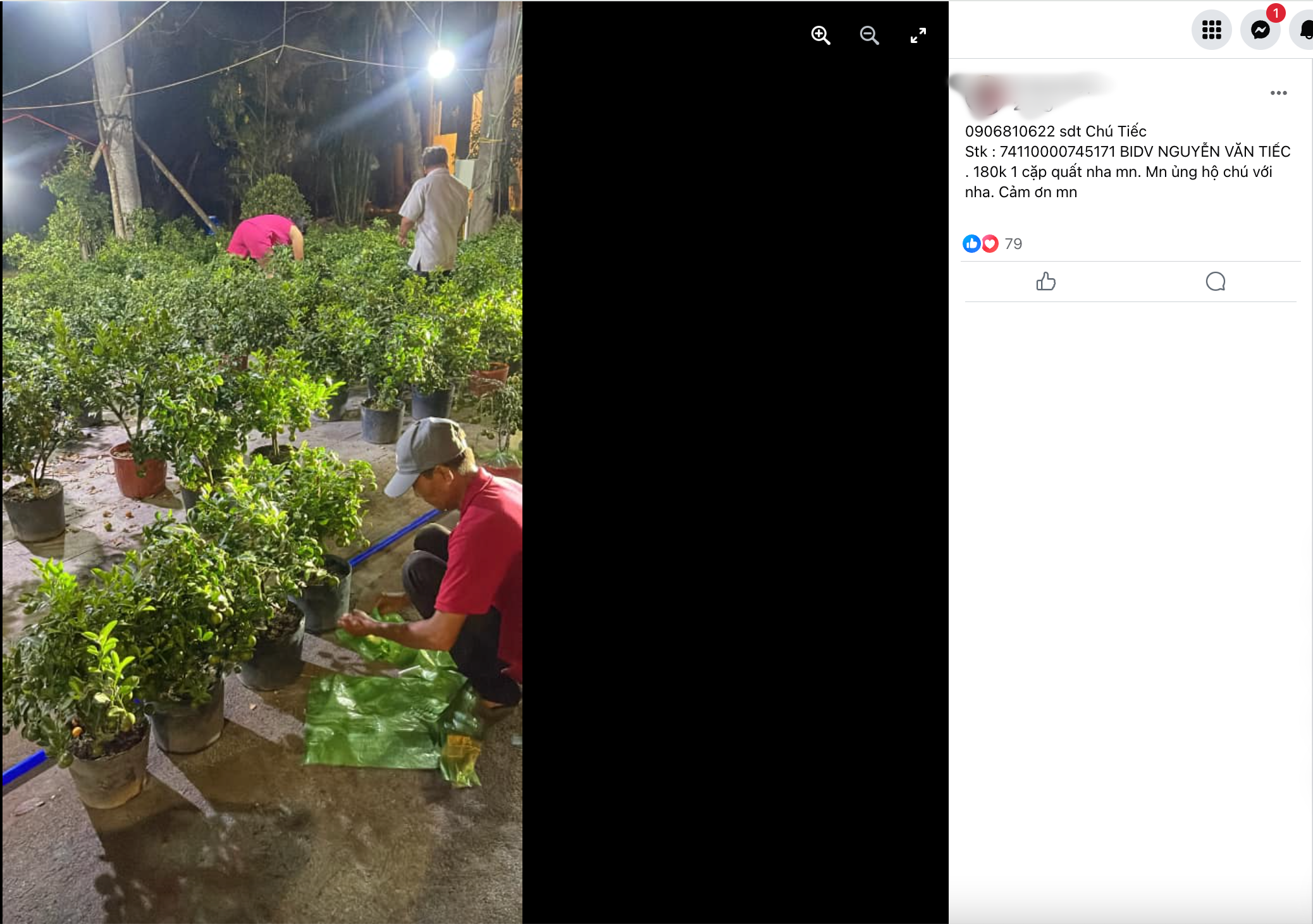 "Chú Tiếc bán lỗ chỉ 180k/2 chậu quất, mọi người có gần đó thì ghé ủng hộ chú nhé. Hôm qua đi ngang cứ thấy chú đứng dòm ra ngóng khách vào mua. Thấy thương lắm. Người miền Tây chất phác nên dù có lỗ nặng vẫn lạc quan, vẫn chờ ngày về nhà "ăn bù cơm nhà". Sáng mai mình sẽ ghé qua để ủng hộ chú", tài khoản D.K chia sẻ.