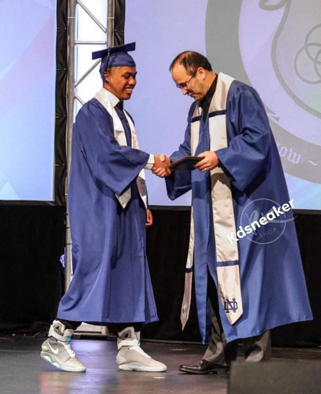 Mới đây trên mạng xã hội lan truyền hình ảnh một dân chơi mang đôi sneaker Nike Air Mag "Back To The Future" đến dự lễ tốt nghiệp khiến cư dân mạng ghen tỵ tức muốn "nổ mắt". Trong hình thầy hiệu trưởng tuy tuổi tác đã cao nhưng khi trao bằng cho chàng trai cũng phải ngước xuống chân nhìn vào đôi giày một phát vì độ nổi tiếng của nó.