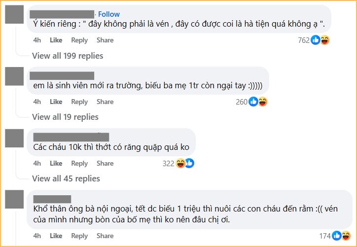 Ngoài việc bất bình vì gia đình này để ông bà nội - ngoại “bao” chuyện ăn uống từ Tết đến hết rằm tháng Giêng, nhiều người còn cho rằng việc cô không chi 1 đồng cho việc mua quần áo mới là tư duy sai lầm. Người lớn có thể không quan trọng việc cứ đến Tết là phải có quần áo mới để mặc, nhưng trẻ con thì khác. Không cần sắm quá nhiều, nhưng ít nhất cũng nên mua cho 2 con, mỗi cháu 1 bộ đồ mới.