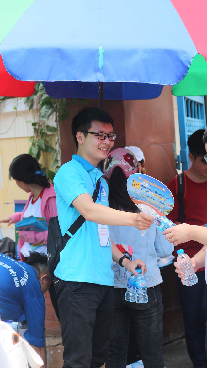 "Bọn mình ở Viện đào tạo Chất lượng cao - Đại học Hàng hải Việt Nam. Mấy hôm nay ở thời tiết ngoài Bắc khá khó chịu, khá nắng nóng và bọn mình hôm nào cũng có mặt tại điểm thi lúc 6h sáng, không chỉ để động viên giúp đỡ các em thí sinh mà còn động viên các bác phụ huynh nhiều nữa. Ngoài ra để tạo điều kiện tốt nhất cho các em thí sinh đi thi thì bọn mình còn hỗ trợ dọn dẹp sau giờ thi và phát nước" - Hải chia sẻ.