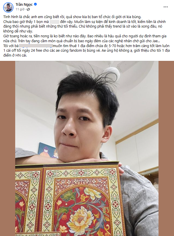 Mới đây, đến lượt nam MC đình đám và đang rất được chú ý hiện nay - MC Trần Ngọc cũng lên tiếng về sự việc. Nam MC kỳ cựu không giữ được sự bình tĩnh, thậm chí dùng từ ngữ rất nặng để chỉ trích BTC sự kiện. Đáng nói, theo nam MC, đã có những người kỳ công làm hẳn những sản phẩm handmade chất lượng để tặng cho các nghệ sĩ khi sang thực hiện concert.