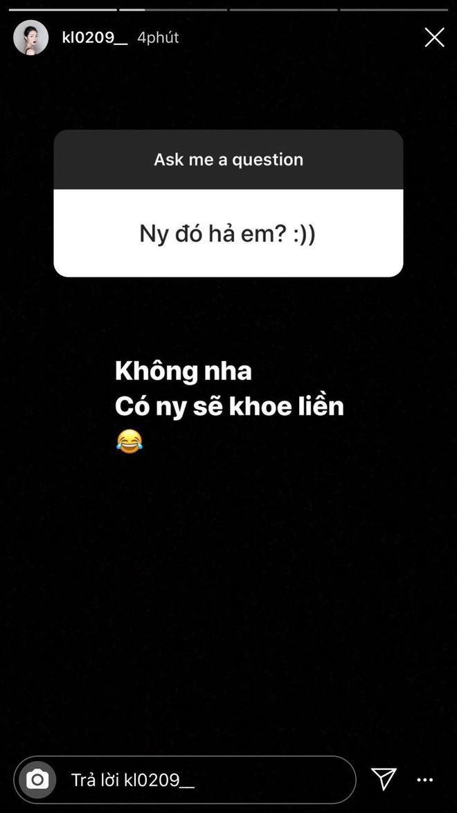 Tuy nhiên, giữa lúc dân tình bán tin bán nghi thì mới đây, Khánh Linh đã mạnh mẽ phủ nhận việc mình đang hẹn hò thông qua story Instagram. Được hỏi là "Người yêu em đó hả", Khánh Linh đáp rất căng rằng: "Không nha, có người yêu sẽ khoe liền". Khi được hỏi "thích Messi hơn hay Bùi Tiến Dũng", Khánh Linh cũng né tránh bằng cách trả lời rằng mình thích Gigi Harid hơn.