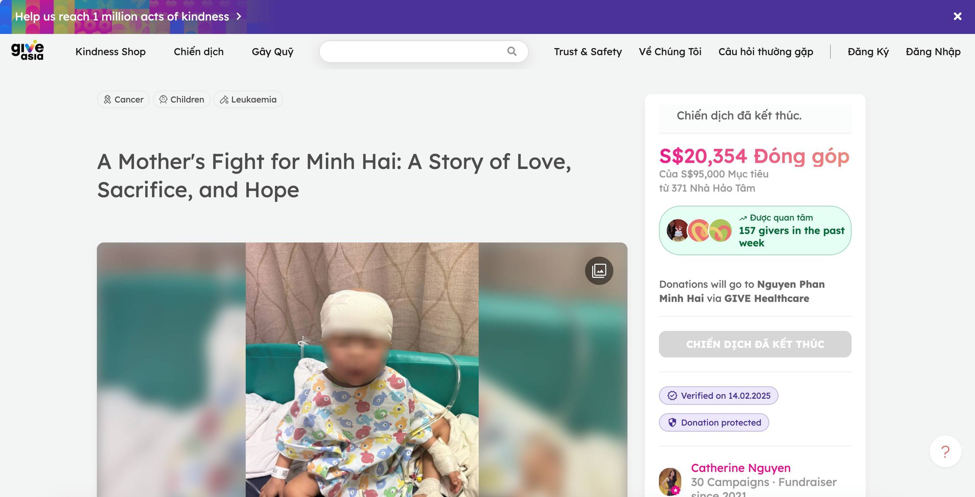 Trên Give.Asia, chiến dịch "A Mother's Fight for Minh Hai" bắt đầu từ 14/2/2025, hướng tới mục tiêu gần 100.000 SGD (hơn 1,8 tỷ đồng) cho bé Minh Hải.