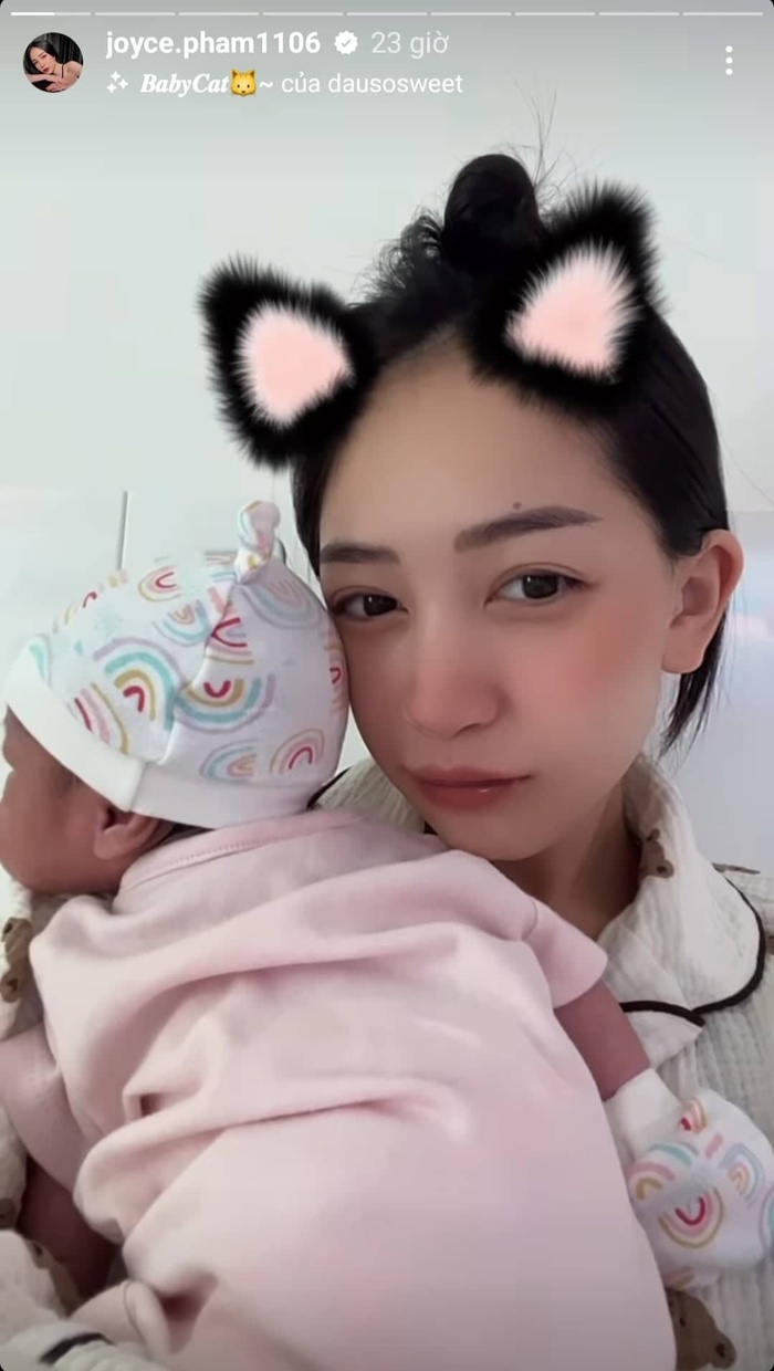 Sau gần 1 tháng ở cữ, mới đây trên trang cá nhân Joyce Phạm cũng chịu chia sẻ một phần hình ảnh đáng yêu, kháu khỉnh của nhóc tỳ khiến netizen tò mò. Cụ thể, con gái đại gia Minh Nhựa khoe một góc bàn tay nhỏ xinh cùng với chiếc miệng chúm chím của nhóc tỳ, khiến ai thấy cũng đều thích thú với độ dễ thương siêu cấp của bé. Khán giả còn trêu ái nữ "sinh ra từ vạch đích" khiến mẹ bỉm phấn khích.