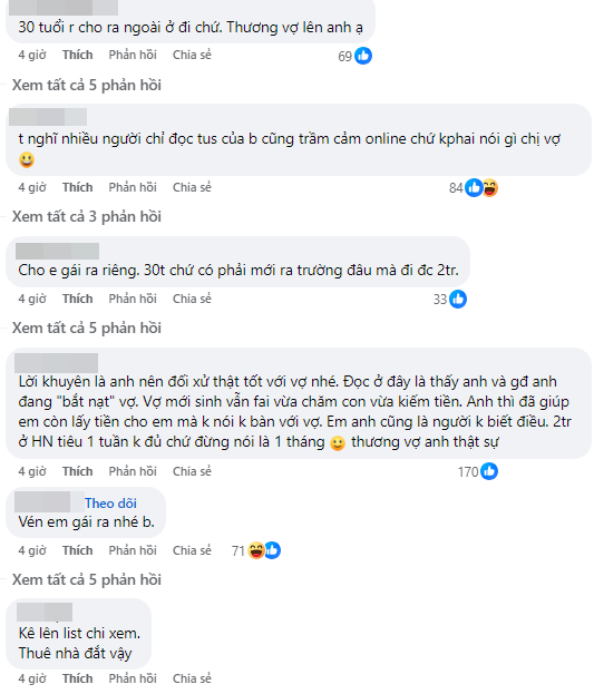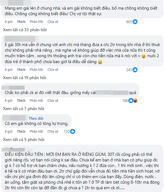 Dưới phần bình luận, mọi người đều thương xót cho người vợ khi phải một mình quán xuyến quá nhiều thứ. Dù vừa sinh xong đã phải làm việc online kiếm thêm thu nhập. Trong khi chồng không hề hay biết mỗi tháng đều chi tiêu gần hết số tiền kiếm được, người em gái ở cùng đóng chi phí như vậy là chưa hợp lý, bố mẹ chồng quở trách con dâu khi chưa biết rõ sự tình...