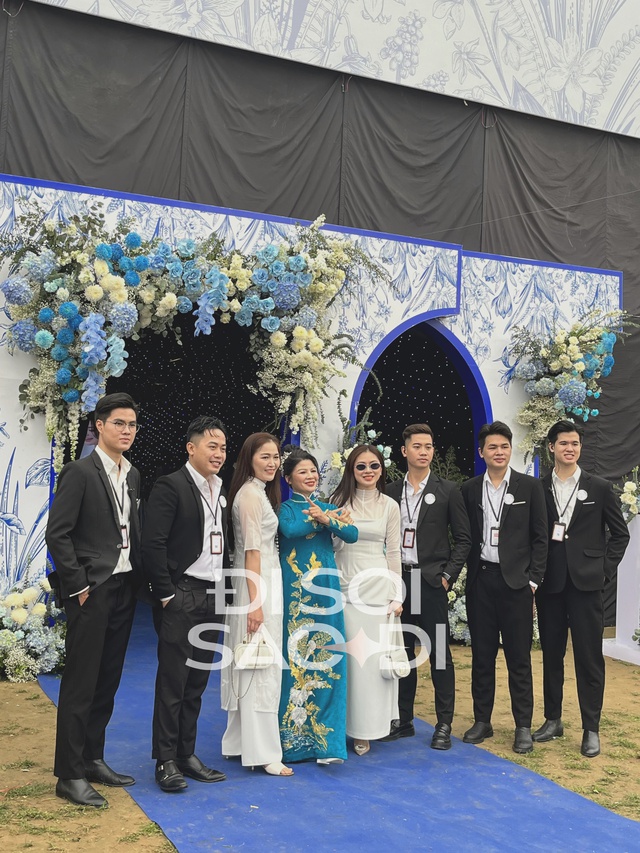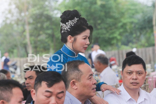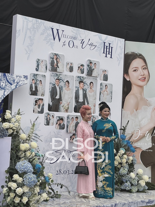 Mẹ của Quang Hải đã dậy sửa soạn từ tờ mờ sáng, vừa khoảng 9h đã xuất hiện tại rạp cưới để tiếp đón quan khách. Mẹ chú rể bới tóc chỉn chu, mặc áo dài màu xanh sang trọng, hào hứng đứng chụp hình kỷ niệm cùng họ hàng, người quen tại rạp cưới hoành tráng.