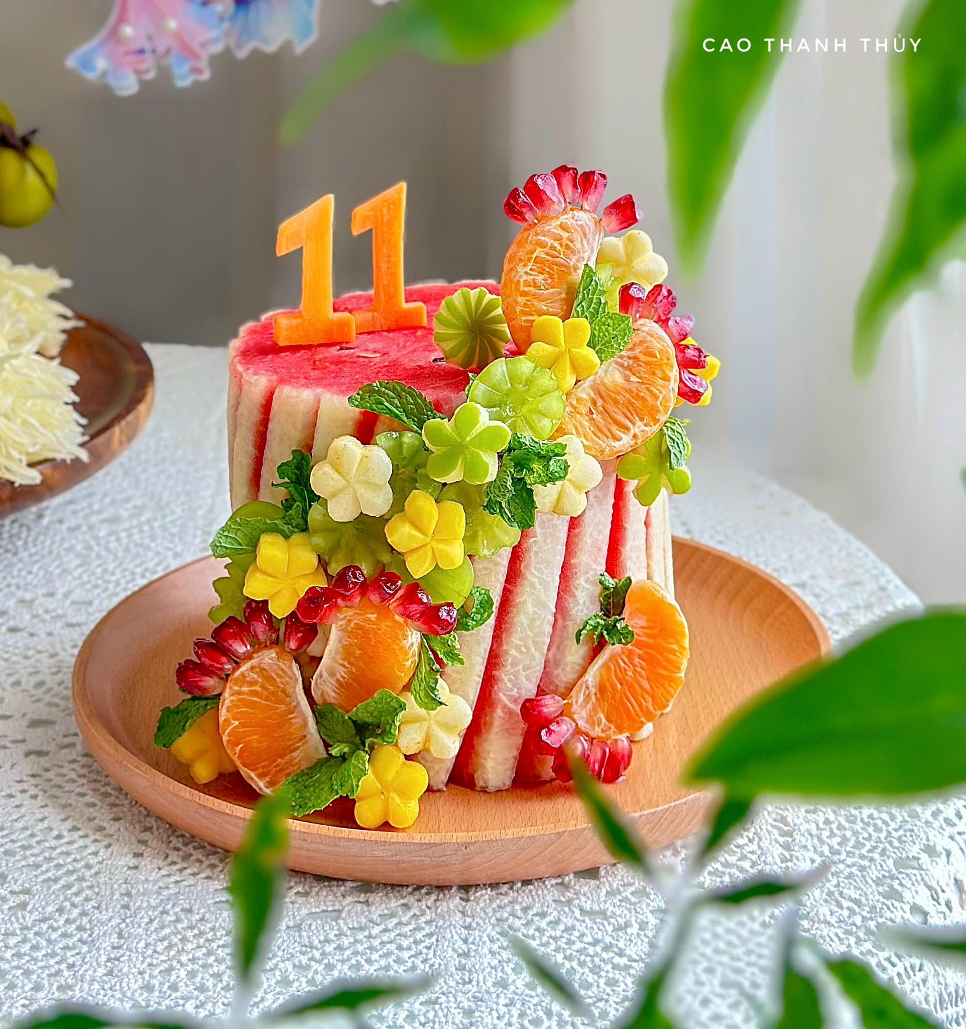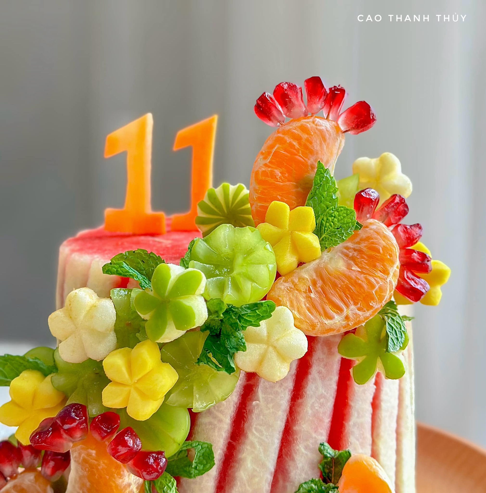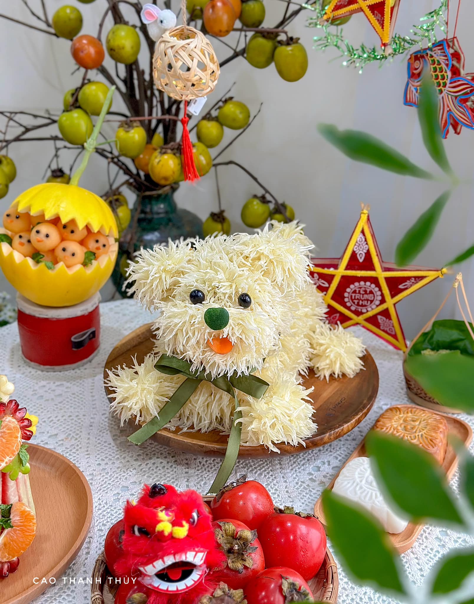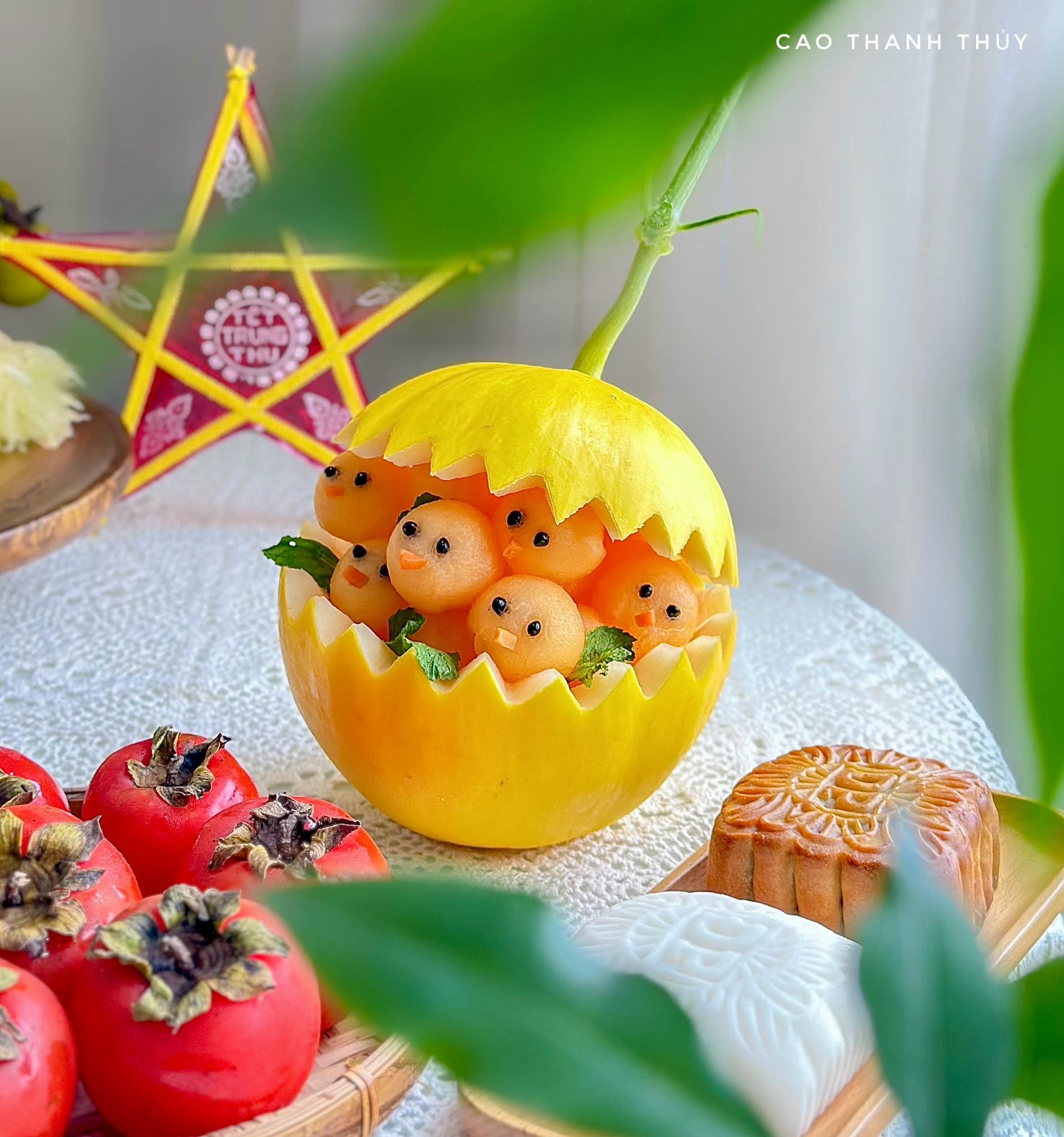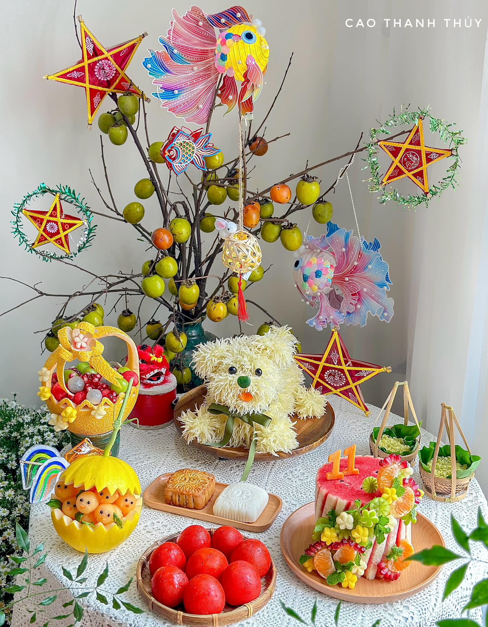 Những thứ nhìn đơn giản, xinh yêu nhưng mất khá nhiều thời gian để tỉa, trang trí và trình bày. Bữa tiệc Trung thu vẫn đầy đủ các thức quả, ngôi sao, bánh dẻo... nhưng được chị Thủy sáng tạo hơn khiến mâm cỗ trở nên vô cùng bắt mắt.