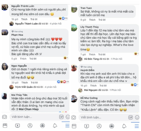 Nhiều lúc chỉ muốn dọn quần áo bỏ nhà đi vì gia đình cứ bắt có người yêu đây. Tự giác thôi nào' - một dân mạng khác bình luận.