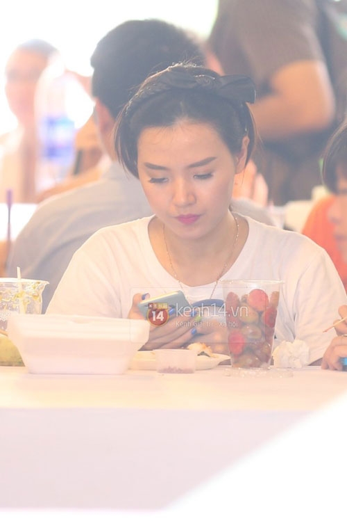 Midu tranh thủ vừa ngồi ăn vặt, vừa giải quyết công việc trong một sự kiện do cô và chồng sắp cưới đứng ra tổ chức vào sáng qua |