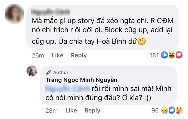 Mọi thắc mắc netizen đưa ra, dù là động viên hay "cà khịa" đều được nữ ca sĩ trả lời đầy đủ. Trong số đó có những comment cho rằng cả hai chia tay thì cũng đã chia tay rồi, Lương Minh Trang còn đăng Facebook, đăng story "đá xéo" chồng cũ hoài là không nên. Trước những ý kiến này, Minh Trang thẳng thắn đưa ra nhiều lý do giải thích khác nhau: