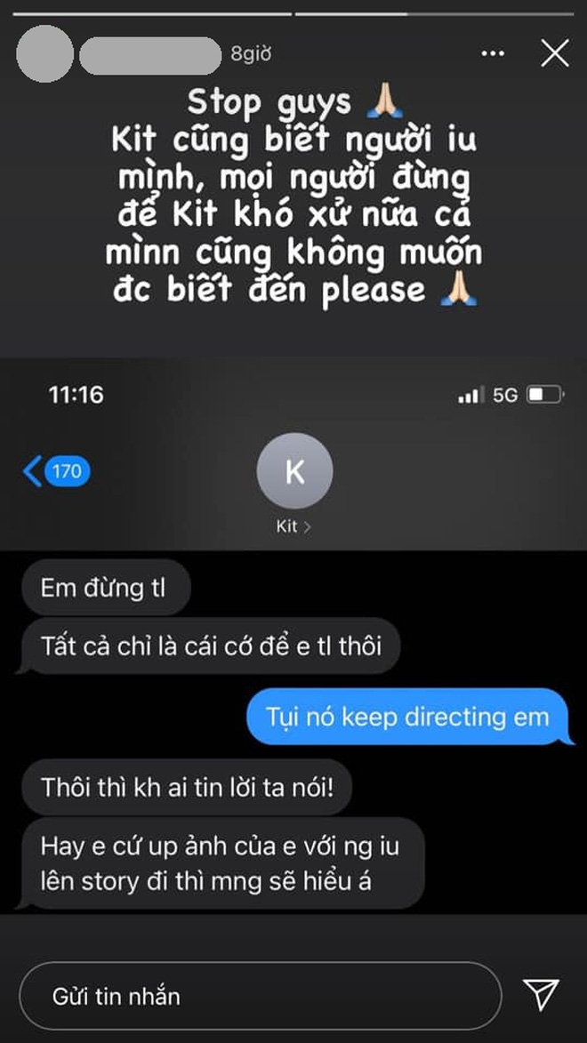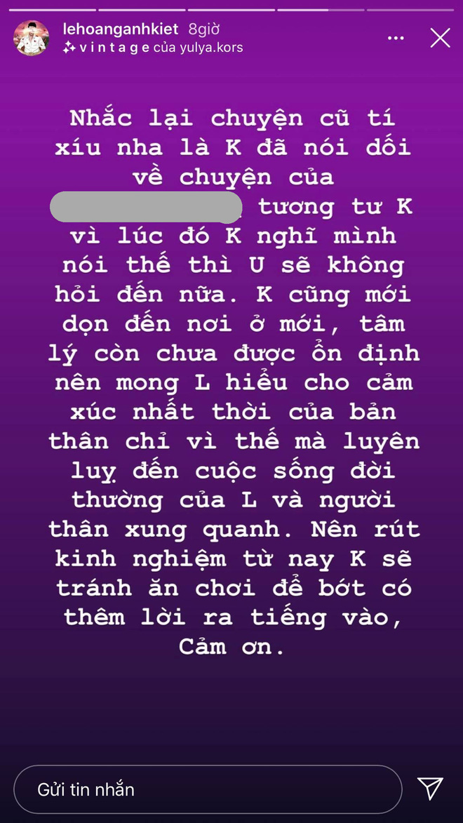 Tuy nhiên, L cũng chứng minh mình "trong sạch" khi tung chứng cứ minh oan cho bản thân và khẳng định không liên quan. Cô nàng cho biết hoàn toàn không hiểu tại sao Kiệt lại đưa ra những thông tin như vậy về mình đồng thời công khai ảnh chụp cùng bạn trai. Cuối cùng, L đề nghị Kiệt phải công khai đính chính vì đã nói sai về mình.