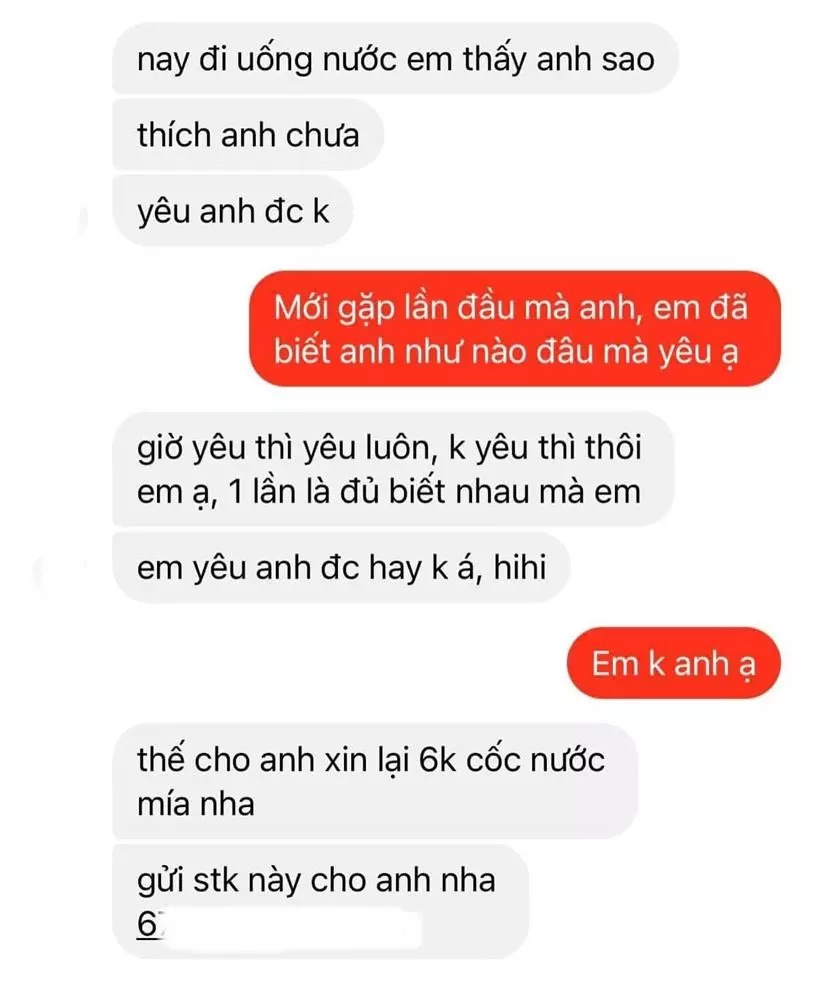Điều bất ngờ nằm ở việc anh chàng ngay lập tức "lật mặt" đòi 6k nước mía mời cô gái trong buổi hẹn. Và để nhấn mạnh rằng bản thân rất nghiêm túc, anh chàng còn gửi kèm theo số tài khoản ngân hàng để cô gái chuyển tiền cho tiện.