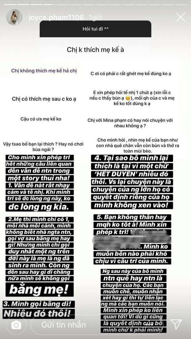 Trong tuần trăng mật của Joyce Phạm, con gái "bà cả" chính thức đăng story một lần nói hết về mối quan hệ với "vợ hai" Mina Phạm, vì sao không gọi Mina là mẹ. Rich kid sinh năm 1999 đã nói thẳng: "Mình đã phải đính chính bao nhiêu lần ai là bố ai là mẹ của mình. Đừng dùng chữ mẹ khi người đó không phải mẹ của mình".