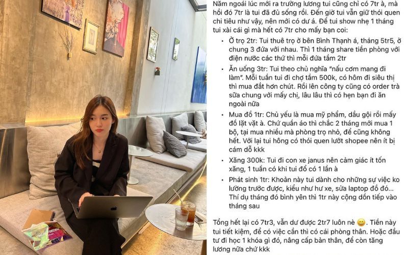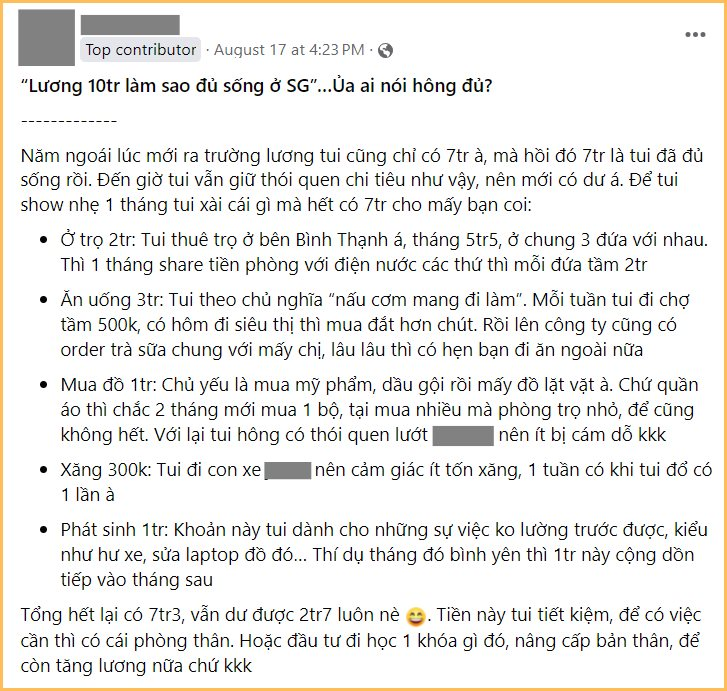 Mới đây, trong một cộng đồng những người làm việc trong lĩnh vực content, một cô gái trẻ đã kể về cách chi tiêu, tiết kiệm khi sống ở TP.HCM với mức lương 10 triệu đồng/tháng. Dù phải đi thuê nhà nhưng mỗi tháng cô bạn vẫn tiết kiệm được 2,7 triệu đồng.