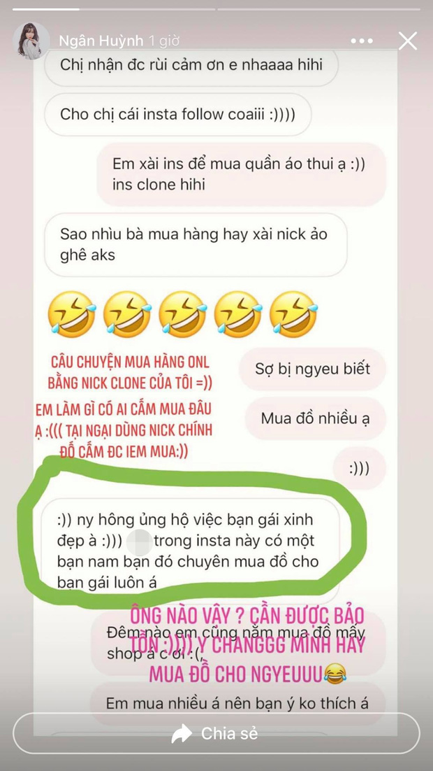 Mới đây, Ngân Sát thủ đăng story kể chuyện dùng nick clone để đi mua hàng online khiến nhiều người chú ý. Theo đó cô nàng giải thích với người bán hàng rằng mình dùng Instagram ảo đi mua quần áo vì "sợ bị người yêu biết mua đồ nhiều" và đêm nào cũng nằm mua đồ từ mấy shop lận nên "bạn ý không thích".