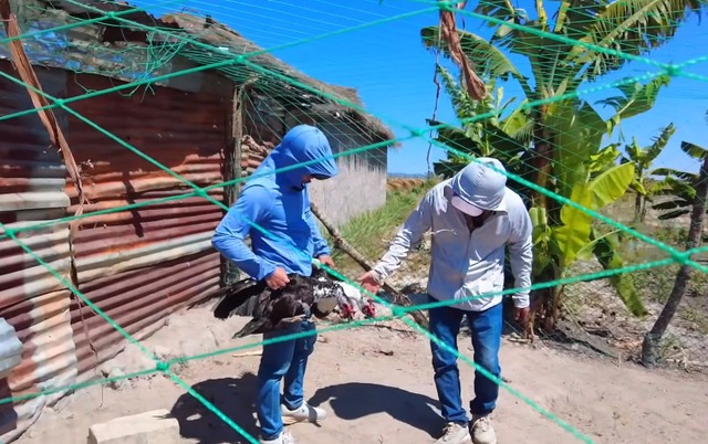 Anh Hùng cùng mọi người bắt một con ngan trống nặng 5kg trong trang trại. Sau khi làm thịt ngan, mọi người đem ngan đi thui vàng cho thơm hơn.