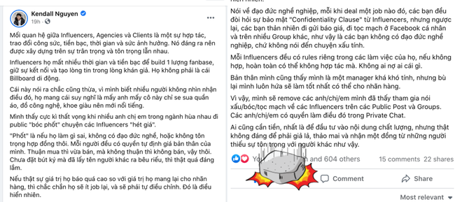 Bài đăng này sau đó đã tạo ra nhiều luồng tranh cãi. Liên quan đến vấn đề Booking Influencer, Kendall Nguyen - quản lý của Fashionista Khánh Linh và Mew Amazing cũng đã lên tiếng trên trang cá nhân.