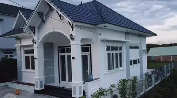Ngôi nhà thiết kế kiểu nhà cấp 4, mái Nhật, được sơn màu trắng chủ đạo kết hợp với màu xanh nước biển làm điểm nhấn gồm: hai phòng ngủ, một phòng khách, một bếp, hai nhà vệ sinh cùng khoảng sân trước, sân sau rộng rãi.