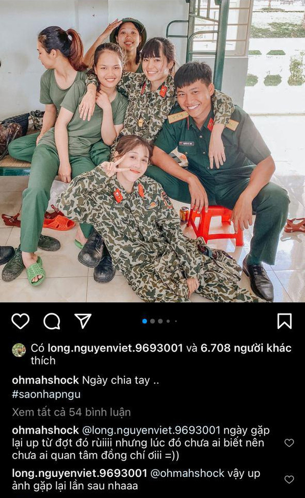 Cụ thể, Hậu Hoàng đã đăng ảnh ngày cuối cùng còn ở đơn vị ghi hình Sao Nhập Ngũ kèm caption: "Ngày chia tay...". Ngay lập tức, Mũi trưởng Long có mặt hỏi bâng quơ: "Vậy còn ngày gặp lại...".