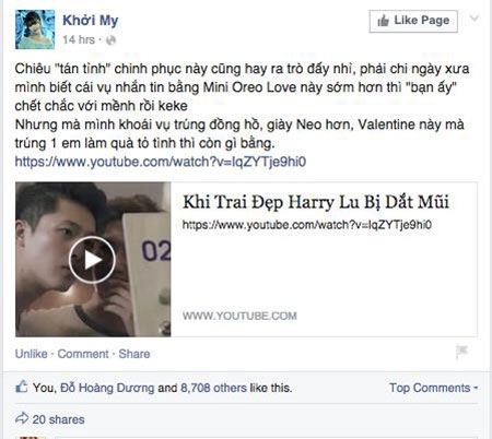 Đặc biệt, điểm chung ở đây chính là công cụ nhắn tin mới được các bạn trẻ vận dụng một cách linh hoạt và sáng tạo khiến trái tim “nửa kia” không khỏi rung rinh. Bắt nguồn từ chiêu trò tán tỉnh Harry Lu của hotgirl Hà Lade trong clip Khi Trai Đẹp Bị Dắt Mũi đang thu hút các bạn trẻ hiện nay (https://www.youtube.com/watch?v=IqZYTje9hi0), bạn Lân Nguyễn hào hứng chia sẻ: “Valentine năm nay cận Tết nên chúng mình đành phải đón một mùa yêu ở xa nhau. Thế nhưng mình đã “bỏ nhỏ” hội chiến hữu trong thành phố cả rồi, mình sẽ dùng app Mini Oreo Love để cho cô nàng những gợi ý, từ đó tìm thấy món quà Valentine công phu của mình!”