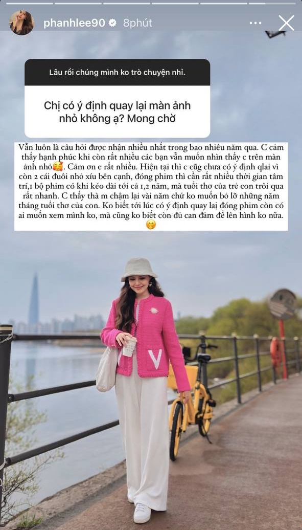 Mới đây, khi mở Q&A, Phanh Lee đã trực tiếp giải đáp thắc mắc từ cư dân mạng về chuyện quay lại màn ảnh nhỏ. Cô cho biết đây là câu hỏi mà mình nhận được nhiều nhất trong những năm vừa qua và rất hạnh phúc vì điều đó. Tuy nhiên hiện tại Phanh chưa có ý định lên sóng trở lại.