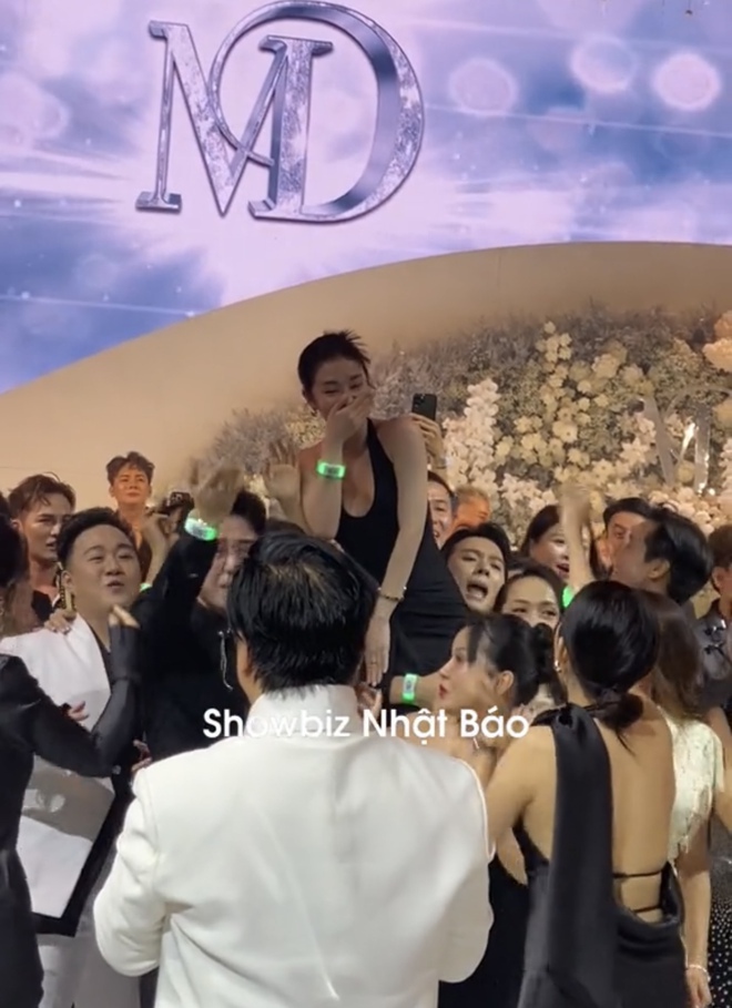 Đặc biệt, trong một khoảnh khắc cuối bữa tiệc, khi Midu và thiếu gia Minh Đạt chuẩn bị tung hoa, Hải Nam bỗng bế Jun Vũ lên cao khiến cả hội trường bất ngờ. Người đẹp sinh năm 1995 lộ rõ vẻ ngượng ngùng khi bản thân đang được bế cao nhất, chiếm trọn spotlight của màn bắt hoa. Điều này khiến không ít đồng nghiệp, bạn bè xung quanh có mặt ngay lúc đó và cả cộng đồng mạng đều cực kỳ thích thú, nhiệt tình "đẩy thuyền".