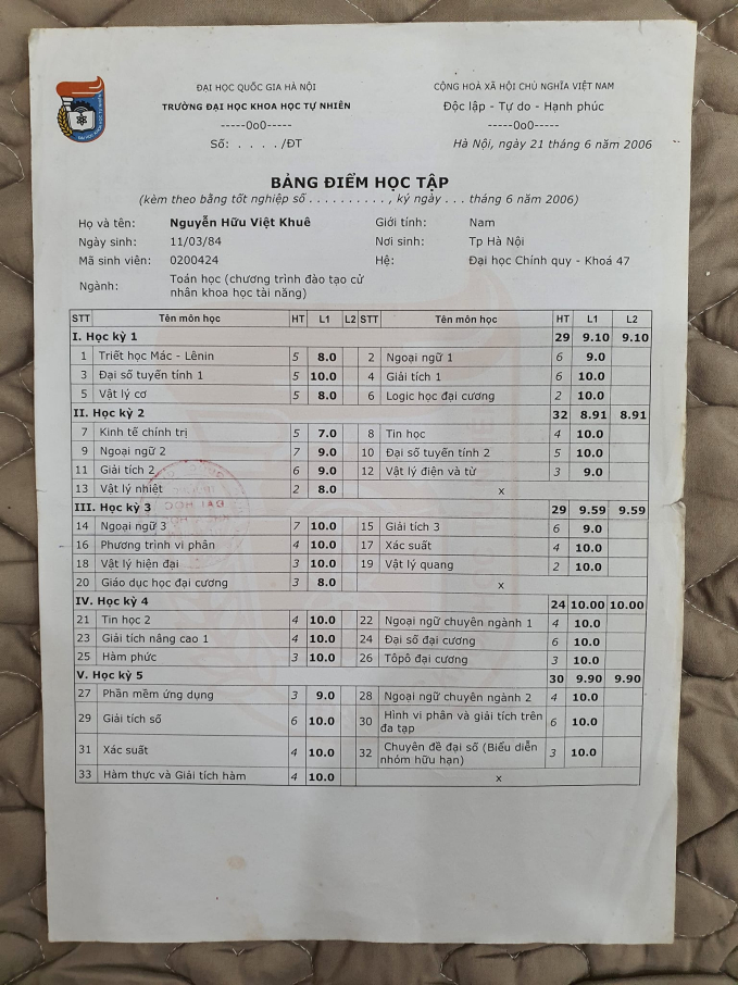 "Mấy hôm nay thấy các cháu học sinh flex các bảng điểm mà 100% điểm 10, tự nhiên chú Khuê nhớ ra mình cũng có một chiếc bảng điểm đã gìn giữ cẩn thận gần 20 năm qua. Tuy không 100% điểm 10 như các cháu nhưng cũng phải có tới đến 95% là điểm 9; 10, và đây lại là một chiếc bảng điểm tốt nghiệp Hệ Cử nhân Khoa học Tài năng chuyên ngành Toán trường Đại học Khoa học Tự nhiên. Khi chú trở lại với việc dạy Toán, ai gặp cũng hỏi sao mà chú nhớ giỏi thế?