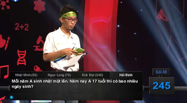 Những đáp án ấy không chính xác nên quyền trả lời thuộc các thí sinh còn lại. Lê Đức Đạt (học sinh Trường THPT chuyên Lương Văn Chánh, Phú Yên) nhấn chuông giành quyền trả lời và đưa ra đáp án: 16. Đây cũng là đáp án sai và MC Diệp Chi sau đó công bố đáp án đúng là 1. Mỗi người chỉ có 1 ngày sinh mà thôi. Đáp án này khiến cả trường quay ố á bởi tất cả mọi người đều bị đánh lừa bởi câu hỏi mẹo quá đơn giản.