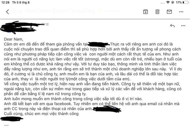 Kèm theo lời tâm sự của khổ chủ là ảnh chụp màn hình ghi lại lời từ chối hết sức có tâm của Giám đốc công ty. Hóa ra, cậu nam sinh này bị trượt vì... quá tài năng.