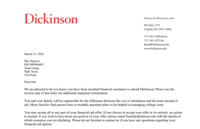 Đó là em Nguyễn Bành Đức ở thôn Lam Thủy, xã Xuân Giang, huyện Nghi Xuân, tỉnh Hà Tĩnh, học sinh lớp 12A1 Trường THPT chuyên Đại học Vinh (Nghệ An) đã được 15 trường đại học hàng đầu của Mỹ nhận vào học ngành khoa học máy tính và cấp học bổng. Tổng số tiền mà các trường cho là 1,863 triệu USD (hơn 43 tỷ VNĐ), trường cho nhiều nhất là Dickinson College với 210.400 USD (gần 5 tỷ VNĐ) trong 4 năm học.