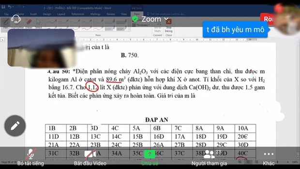 Đính kèm dòng trạng thái là hình ảnh lớp học online đang trình chiếu bài tập Hóa khá khó. Tuy nhiên, mọi sự chú ý của dân mạng lại đổ dồn vào góc phải mà hình nơi dòng tin nhắn hiển thị với nội dung: "Tao đã bao giờ yêu mày mô?"