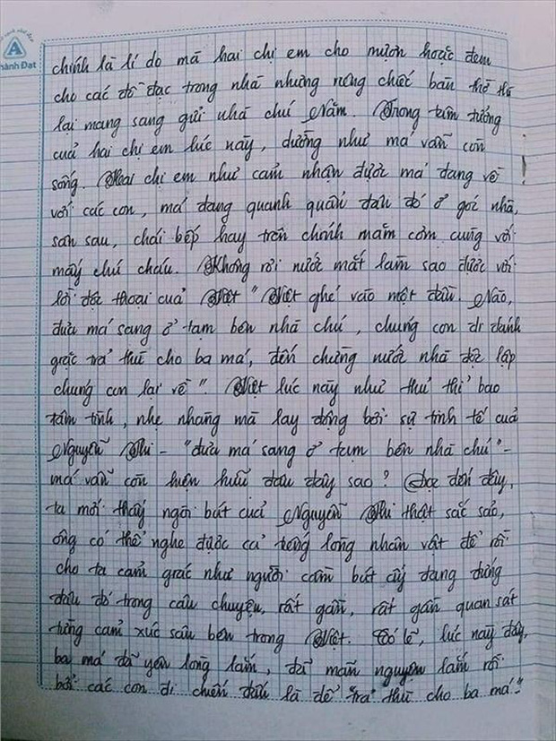 Nhiều cô cậu học trò cũng để lại lời ngưỡng mộ dành cho cậu bạn. "Thực sự là thời đi học mình nghĩ viết đến tờ thứ 2 thôi là bạn đó cũng quá giỏi rồi, đây cậu bạn này còn viết hẳn 18 trang, thực sự nể phục", bạn Hoàng Long cho biết. "Ngày xưa mình cũng từng nhận được điểm 9,5 môn Văn, cũng từng thi học sinh giỏi văn nên mình biết để đạt được điểm số này bạn này phải thực sự thấu hiểu được tác phẩm Những đứa con trong gia đình", bạn Quỳnh Chi nói.
